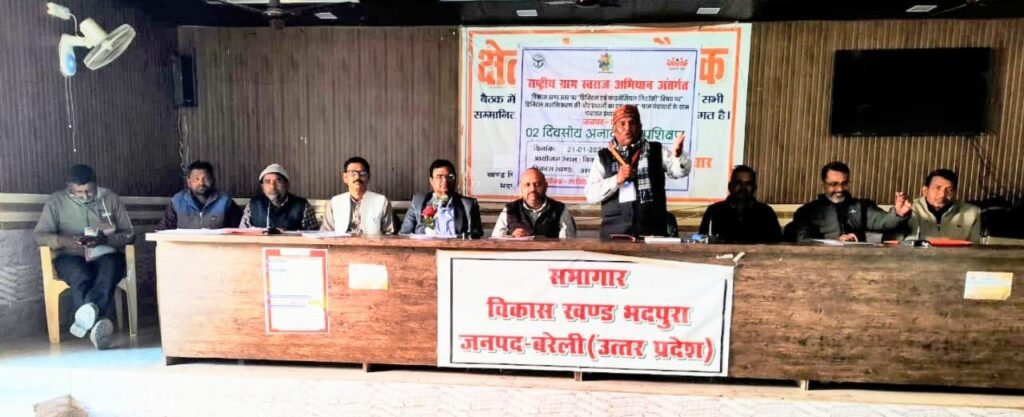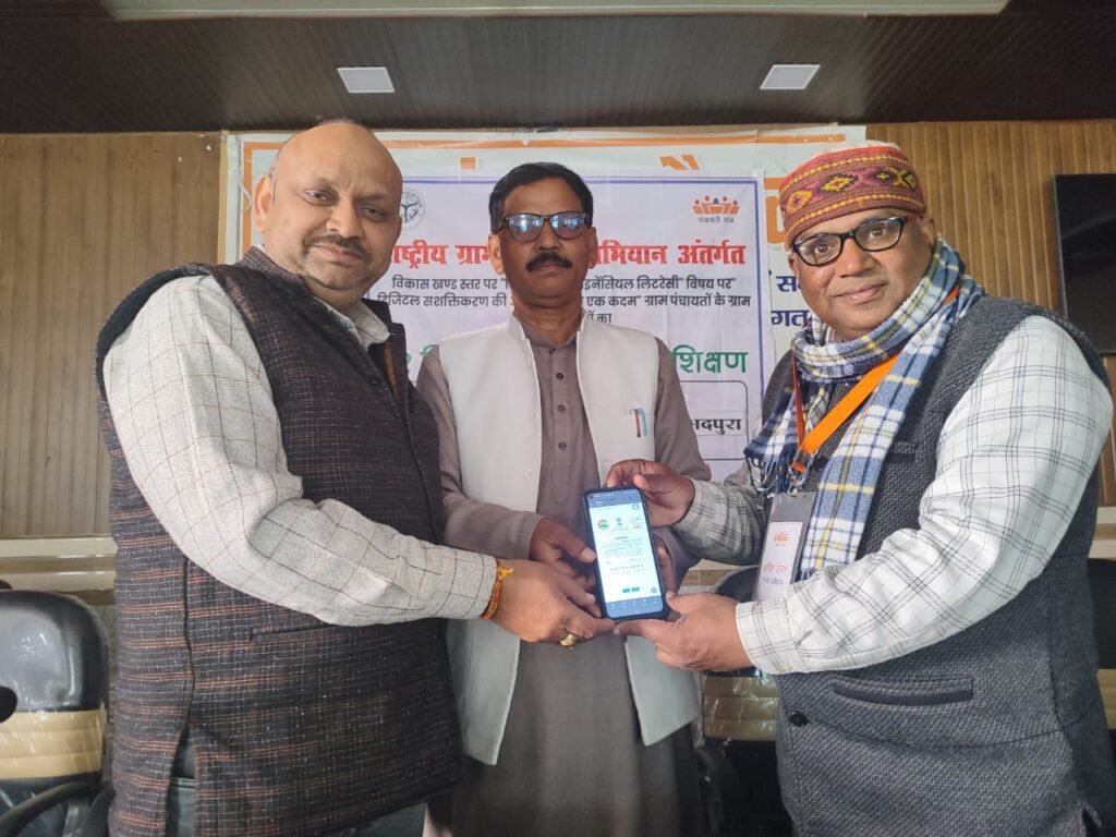 क्यूलड़िया (बरेली)। राष्ट्रीय ग्राम स्वराज अभियान के अंतर्गत उपनिदेशक पंचायत महेंद्र सिंह के दिशा-निर्देशन में विकासखंड स्तरीय दो दिवसीय डिजिटल एवं वित्तीय साक्षरता विषय पर डिजिटल सशक्तिकरण की ओर पंचायत में एक कदम पर प्रशिक्षण विकासखंड सभागार भदपुरा में संपन्न हुआ। राज्य प्रशिक्षकों द्वारा प्रार्थना से द्वितीय दिवस का शुभारंभ किया । राज्य प्रशिक्षक अमित कुमार सिंह तोमर द्वारा प्रथम दिवस का दोहराव कराते हुए विभिन्न पोर्टल की जानकारी दी और इंटरनेट आदि का उपयोग करते हुए कृषि, स्वास्थ्य, शिक्षा, सुरक्षा, सुविधा आदि पर चर्चा की।